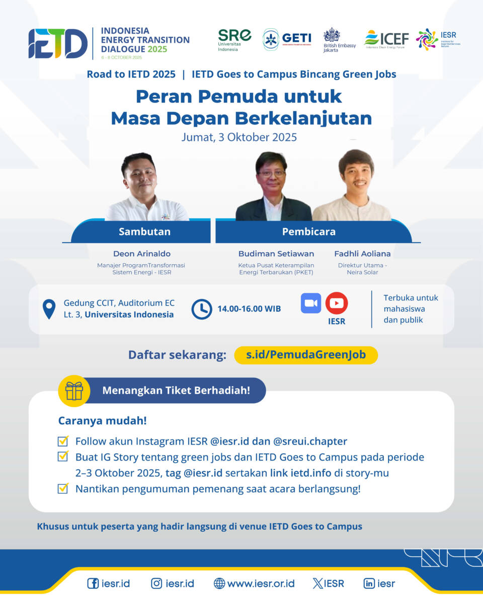 Indonesia Energy Transition Dialogue (IETD) ke-8, yang akan diselenggarakan pada 6-8 Oktober 2025 secara hybrid di Jakarta, merupakan acara tahunan yang diselenggarakan ICEF dan IESR yang berfungsi sebagai platform nasional untuk berbagai pemangku kepentingan dalam mengangkat isu transisi energi di Indonesia. Acara ini akan mengangkat tema dan konsep transisi energi, memfasilitasi diskusi dan merumuskan strategi nasional, mendorong partisipasi multipihak agar mendukung kolaborator dan partisipasi aktif seluruh masyarakat dalam mencapai net zero emission di tahun 2060. Sebagai rangkaian acara menuju IETD ke-8, Seminar Road to IETD 2025: IETD Goes to Campus ini diselenggarakan sebagai platform untuk menjembatani kesenjangan informasi dan meningkatkan wawasan strategis kalangan anak muda untuk dapat berkolaborasi membangun energi bersih Indonesia.