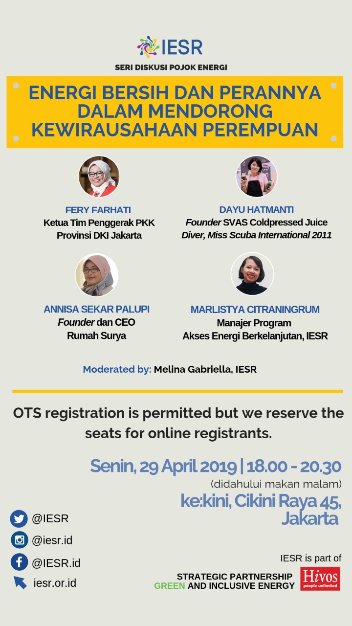 Bertepatan dengan hari Kartini pada 21 April dan hari Bumi pada 22 April, IESR pun mengusung tema “Energi Bersih dan Perannya dalam Mendorong Kewirausahaan Perempuan” serta menghadirkan Narasumber Kartini – Kartini Indonesia yang berkiprah di Industri Energi Bersih/Terbarukan, yakni: