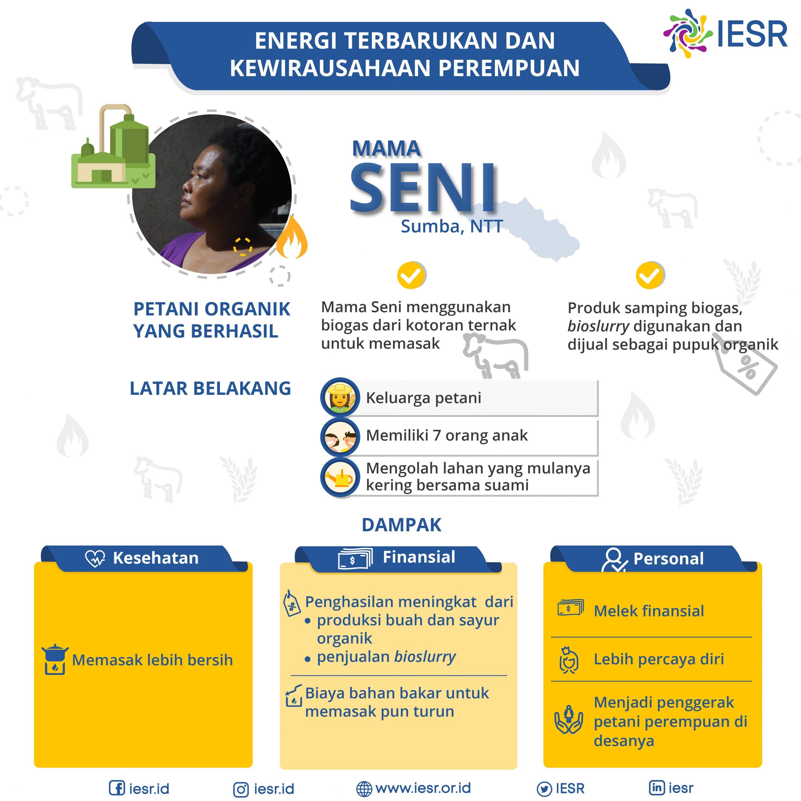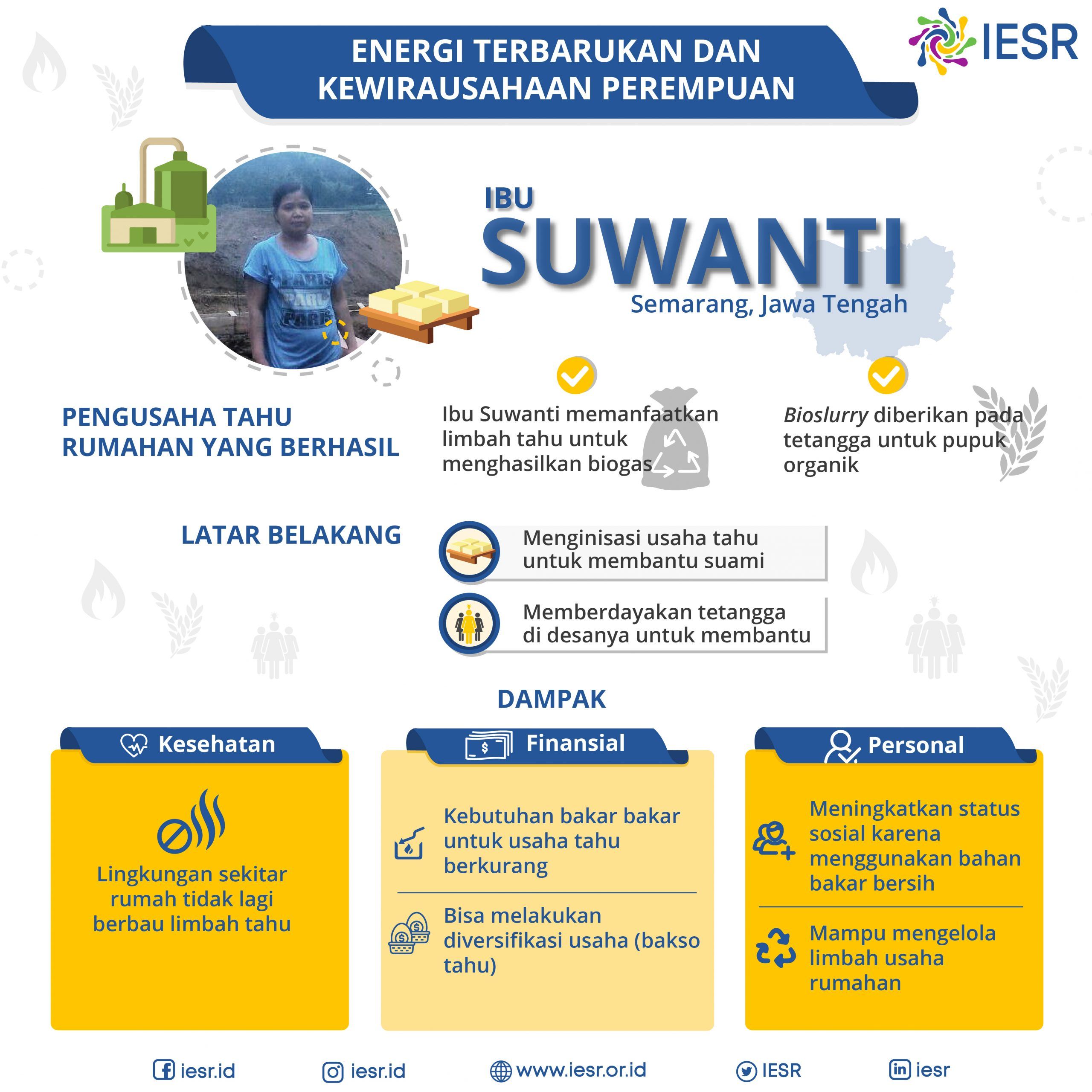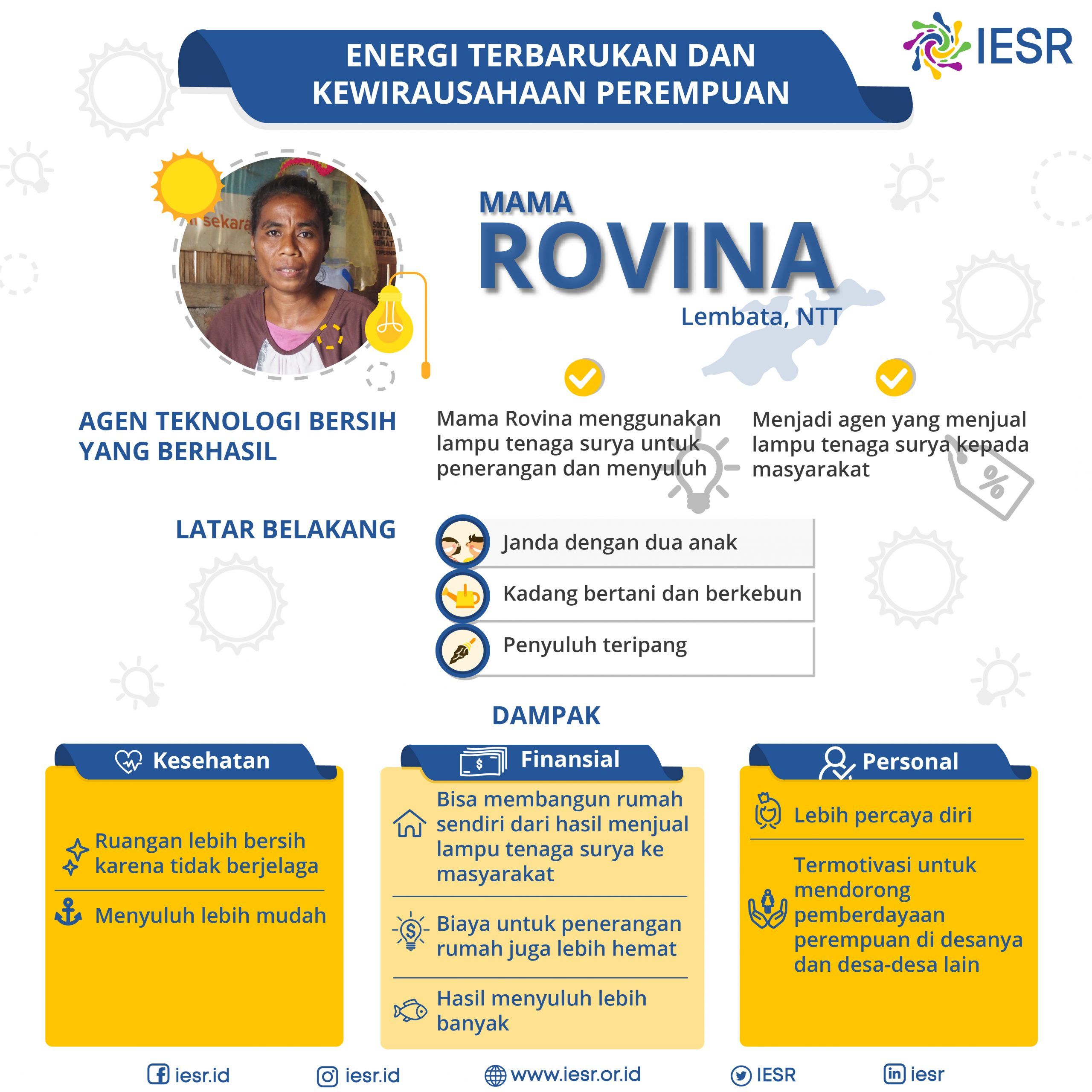Energi Bersih, dan Terbarukan memberikan manfaat yang besar khususnya bagi kaum Perempuan; tidak hanya dalam penggunaannya di rumah tangga, namun juga bagi kebutuhan individu dan pengembangan kewirausahaan mereka. Berikut ini adalah contoh profil Perempuan – perempuan Indonesia yang menggunakan energi bersih dan terbarukan di kalangan sendiri untuk mendukung usaha (kewirausahaan) mereka, yang juga membawa dampak positif bagi kesejahteraan mereka, perkembangan diri, serta kesehatan!
