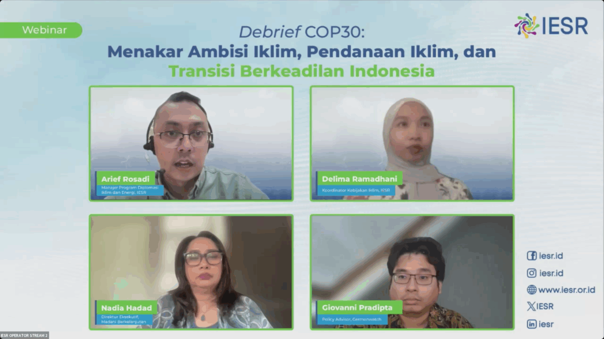 Arief Rosadi, Manajer Program Diplomasi Iklim dan Energi Institute for Essential Services Reform (IESR) dalam webinar Debrief COP30: Menakar Ambisi Iklim, Pendanaan Iklim, and Transisi Berkeadilan Indonesia mengatakan bahwa beberapa isu penting seperti transisi dari energi fosil tidak masuk dalam dokumen kesepakatan.